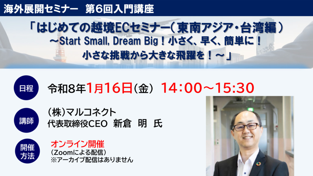 株式会社マルコネクト(本社:福岡市中央区、以下当社)の代表取締役CEO 新倉 明は、2026年1月16日(金)、グローバルコネクト福岡(福岡県商工部スタートアップ推進課 海外展開支援係)主催の海外展開セミナーに登壇することとなりましたので、お知らせいたします。